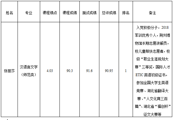 遵照学校通知精神,经学生本人申请,学院资格审核,导师组面试评议,按课程考试成绩和面试成绩汇总排序,拟推荐张丽莎学生为赴武汉大学交流学习人选,特此公示。公示时间为2019年5月14日至2019年5月15日。若对评定结果持有异议,请在公示期内电话或书面向文学院教学办公室反映。联系人:陈老师。联系电话:0716-8062644。