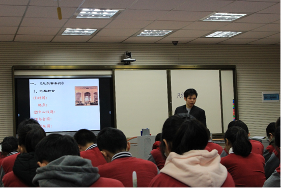 紧接着,我们在东中演播室旁听、观摩了李咏骋老师给九年级学生上的一堂历史课——凡尔赛-华盛顿体系。首先,李老师通过参加巴黎和会的美、英、法三国首脑图片导入新课,接着从三大国参加会议的意图入手,分析巴黎和会的内容、实质和影响。接着指出巴黎和会调整了帝国主义在欧洲的矛盾,远东和太平洋地区的矛盾该如何解决?因而导入华盛顿会议召开及华盛顿体系的建立。课上,老师表达幽默风趣,师生互动良好。我们用笔记的形式记录下自己所体会到的授课方法和观察到学生们在课堂上的反应,对于重点知识和课堂时间的节奏把握也做了相关的记录。伴随着下课铃声的响起,本次教育见习活动也圆满结束。课后,部分历史系学生还针对教学方法和教材内容方面向李咏骋老师请教。