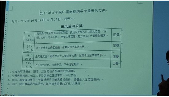 2017年10月10日下午,文学院2015级广播电视编导专业采风动员大会在主教308举行,我院教师雒仁启作为本次前往十堰武当山专业采风的带队老师召开此次动员大会。