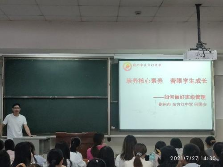 下午两点三十分,我们学员老师开始了下午的学习。来自荆州市东方红中学的何国安老师同样围绕“如何做好班级管理”给学员老师带来了一堂生动、有趣、新颖的教师专业发展教育课。何老师以真实事例导入,面对班级管理的种种困惑,提出问题:那到底如何做好班级管理呢?引发学员们的深思。紧接着他提出要以课程改革为核心,而课程改革的核心在于“德育”。教育需要生命的温暖,需要用爱来交换,推动学生核心素养的发展,现代的德育更是如此。随后何老师对德育方法进行了详细讲解,他期望学员老师们都要做一名有高度职业素养的班主任,做好班级管理。