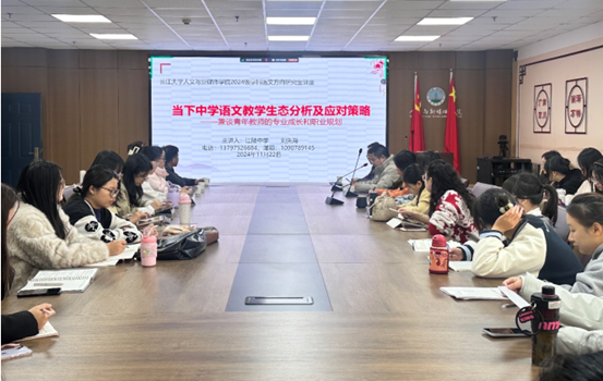 (通讯员王婷)11月22日,受yl6776永利集团副院长杨家海邀请,湖北省特级教师、中国写作学会会员、湖北省教育科研先进个人、荆州市江陵中学副校长刘先海老师于文科楼705室作《当下中学语文教学生态分析及应对策略——兼谈青年教师的专业成长和职业规划》的主题报告。本次讲座由杨家海副院长主持,杨名、陈力、章芳等11位老师和本院30余名专业硕士研究生参加了此次活动。