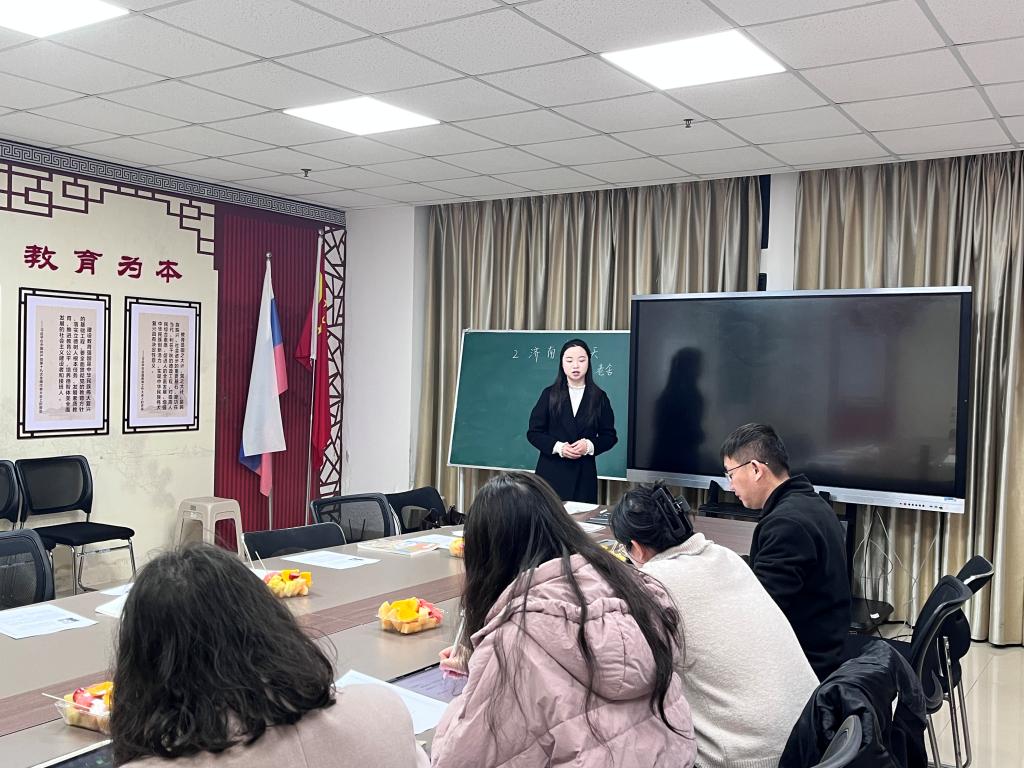 会议伊始,李征宇教授简述了本次活动的主题和意义。随后,崔豫通过“入冬日之境、赏温晴之景、悟作者之情”三部分试讲《济南的冬天》一课,层层递进,逻辑连贯。宋吉祥从情境教学的角度出发,以“制作明信片”为线索贯穿整个学习过程:“让学生依据课文中对济南冬天山景的细腻描绘,绘制明信片,串联起济南冬日山景的特点,突出教学重点。”石梦娜结合板书设计应具备的直观性和观赏性,发表了自己的看法:“在黑板上勾勒出小山轮廓,在此基础上与济南冬日山景的特点进行融合。”李征宇教授强调教学设计要根据环节设置技巧,紧扣文章的特点核心进行教学。