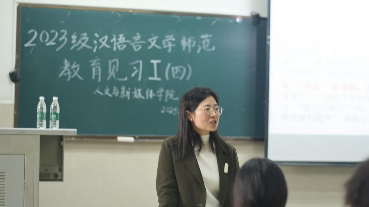 (通讯员彭迪)为夯实师范生教育教学基本功,提升教学技能,我院于2025年10月31日下午在东校区12教102举行了2023级中文师范专业教育见习第四次讲座。本次活动特邀湖北省江陵中学高级教师马素华,作题为《从“教课文”到“育素养”:新课标背景下〈劝学〉的深度备课策略》的专题分享。讲座由章芳老师主持,张丽老师、周霜老师及2023级全体中文师范生参加。