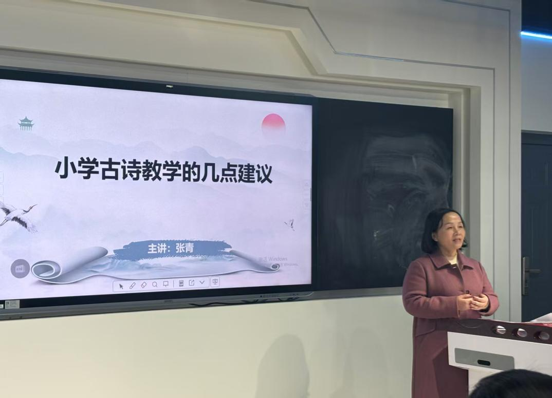 在专题培训环节,张青老师围绕低年级国学教学要点展开细致讲解。她指出,面向一二年级学生开展教学,首先要强化组织教学,保障课堂秩序与学习效果;其次在古诗教学中应坚持深入浅出,忌盲目深挖;同时要避免填鸭式教学与逐字翻译,注重课堂互动与氛围营造,让课堂更具活力。培训中,张青老师以《从军行》《秋夜将晓出篱门迎凉有感》《闻官军收河南河北》三首古诗为例,进行示范性教学展示,清晰讲解古诗词教学“三读法”:读准字音、读通句子;借助释义、读懂句意;反复品读、读出诗情。她强调,授课教师要发挥课堂示范作用,提升课堂感染力与趣味性,着力培养学生的审美情感、文化认同与创新思维。