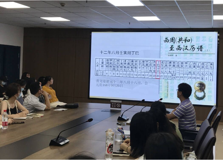 讲座开始之前,李征宇老师对蒋鲁敬博士的到来表示热烈欢迎,并对他的学术研究情况进行了简要介绍。主讲环节,蒋鲁敬博士对郢城遗址的地理位置进行详细介绍,并展示了出土简牍的具体位置。随后,他重点讲述了凤凰山M24出土的告地书和遗策,胡家草场M12出土的岁纪、暦、日至简、日书和记有医方杂方的竹简等,并对竹简所记述的文字进行了详细解释,对竹简背后所代表的含义进行深刻解析,向听众展示了西汉时期的社会风貌和风俗。讲座最后,蒋鲁敬博士还与在座的老师和学生进行了热烈讨论,交流彼此的观点。
