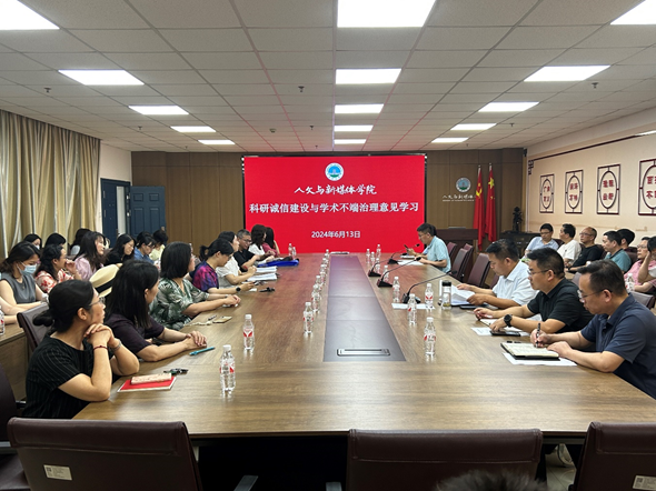 (通讯员 严实 田华蓉)为进一步贯彻落实教育部下发的《教育部关于加强高等学校科研诚信建设和学术不端治理的指导意见》(教科信〔2024〕2号)和《高等学校学术不端行为调查处理实施细则》(教科信〔2024〕3号)的文件精神,6月13日下午,我院科研诚信建设与学术不端治理意见学习动员会,在文科楼705会议室举行。学院领导班子成员、全体教职工参加了大会。