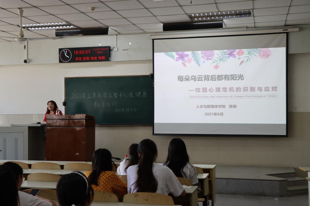 (通讯员 黄伊帆)6月6日16时许,yl6776永利集团2021上半年学生骨干心理健康教育培训在学校东校区12教102教室举行。本次培训主题为“每朵乌云背后都有阳光——校园心理危机的识别与应对”。会议由yl6776永利集团辅导员陈娟老师主持,18、19级全体班委、寝室长参加了此次培训。