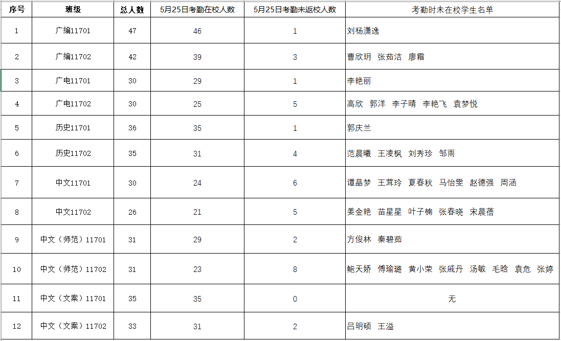 根据《关于加强毕业生毕业期间教育管理工作的通知》精神,现对5月25日2017级毕业生毕业期间在校考勤具体情况通报如下: