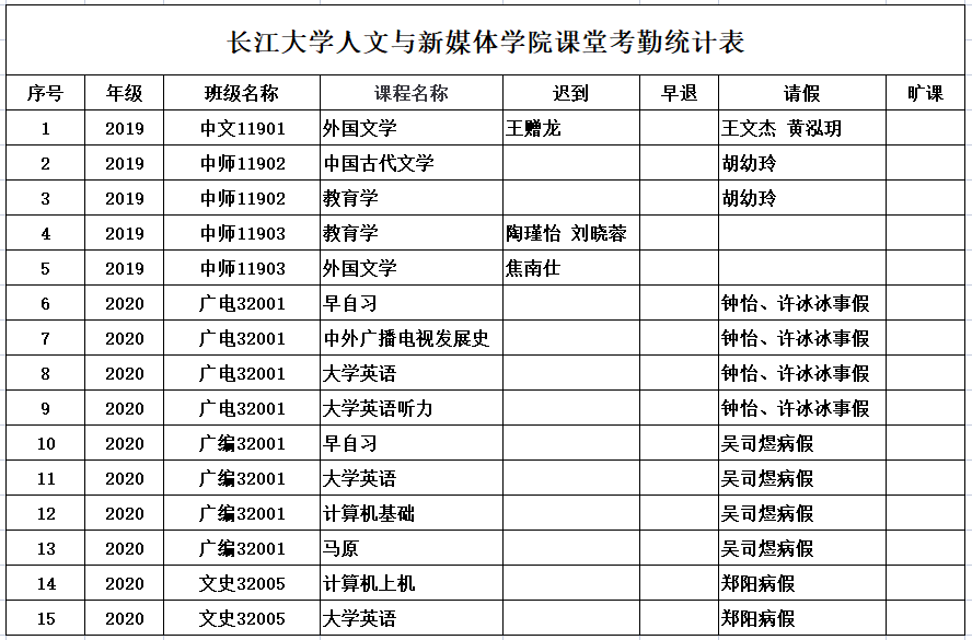 5月24日,我院组织学生干部对18、19、20级30个班的18门课程进行了59次课堂考勤,100%到课率44次,现将考勤结果公布如下:
