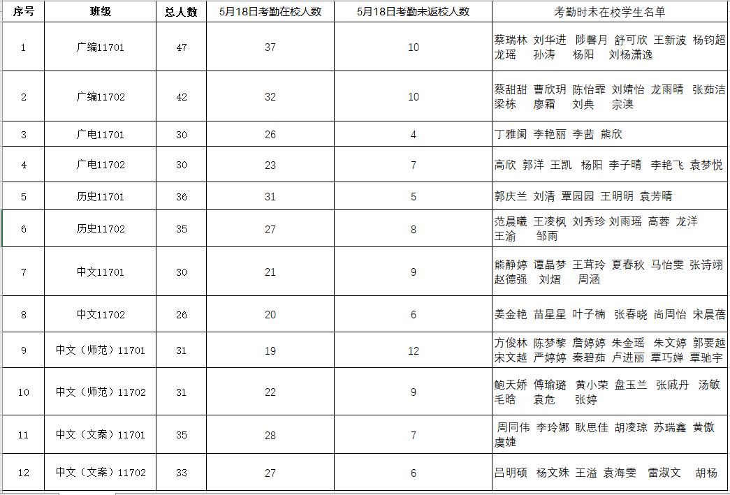 根据《关于加强毕业生毕业期间教育管理工作的通知》精神,现对5月18日2017级毕业生毕业期间在校考勤具体情况通报如下: