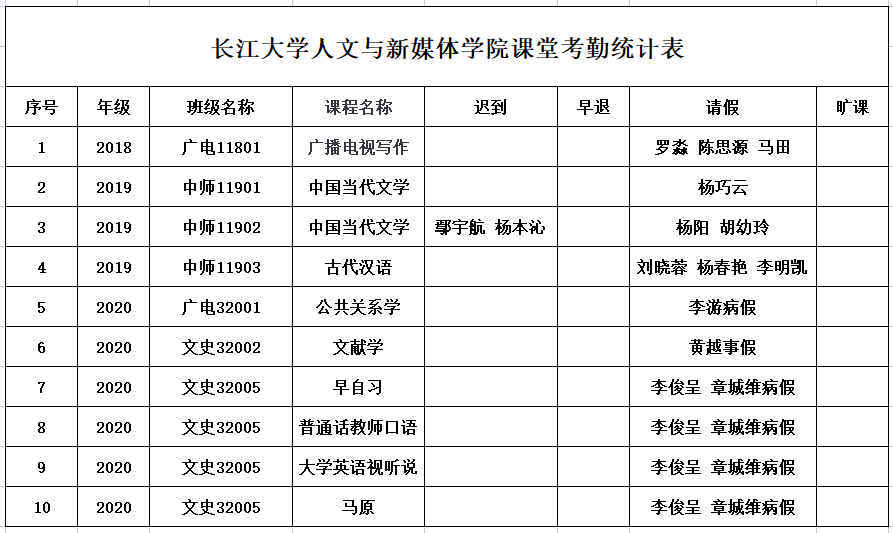 5月18日,我院组织学生干部对18、19、20级30个班的27门课程进行了58次课堂考勤,100%到课率48次,现将考勤结果公布如下: