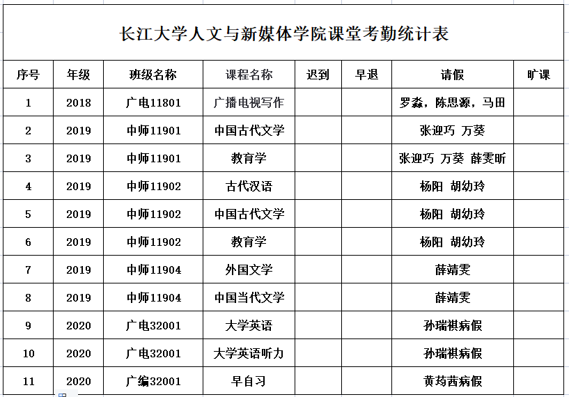 5月17日,我院组织学生干部对18、19、20级30个班的19门课程进行58次课堂考勤,100%到课率47次,现将考勤结果公布如下: