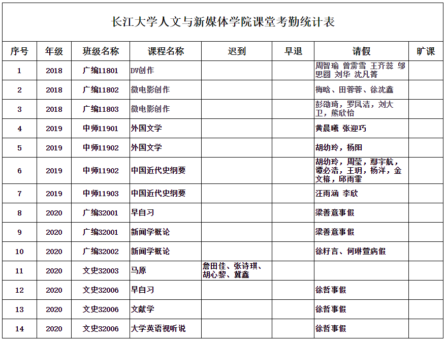5月7日,我院组织学生干部对18、19、20级30个班的23门课程进行56次课堂考勤,100%到课率42次,现将考勤结果公布如下: