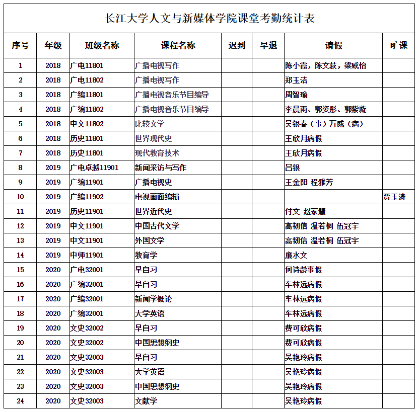 4月21日,我院组织学生干部对18、19、20级30个班的24门课程进行69次课堂考勤,100%到课率45次,现将考勤结果公布如下:
