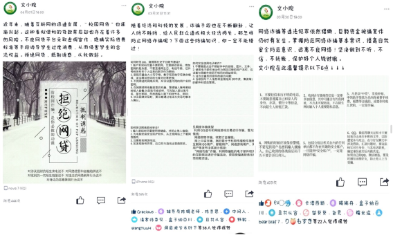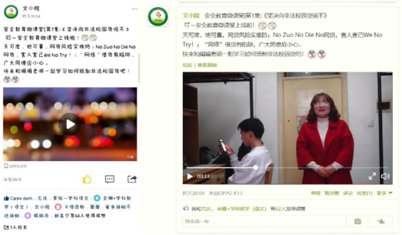 为提升学生的广泛参与度,学院还利用“文小院”等新媒体平台,以图代文,通过“微传播”等形式全面加深学生对防范“非法校园贷”的认识。