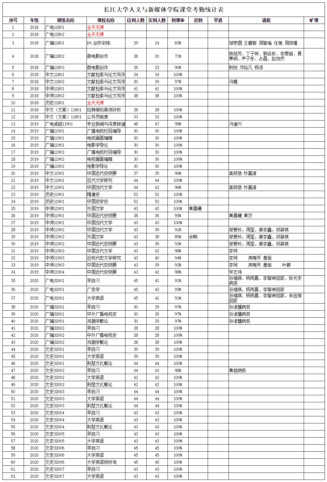 4月2日,我院组织学生干部对18、19、20级30个班的24门课程进行了62次课堂考勤,100%到课率37次,现将考勤结果公布如下:
