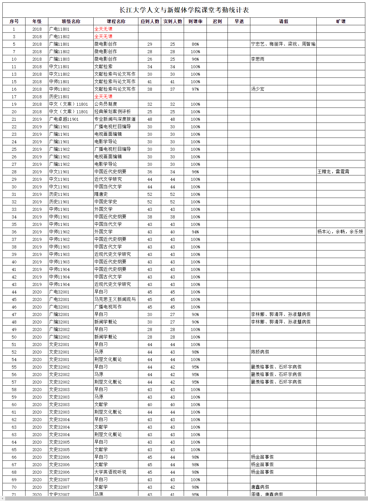 3月26日,我院组织学生干部对18、19、20级30个班的26门课程进行了68次课堂考勤,100%到课率44次,现将考勤结果公布如下: