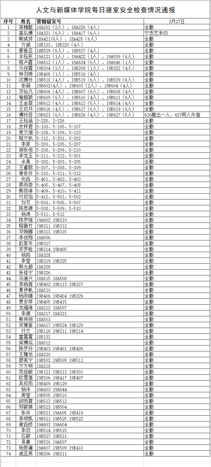 3月27日,我院组织学生干部对18、19级的宿舍进行每日寝室安全检查,现将考勤结果公布如下: