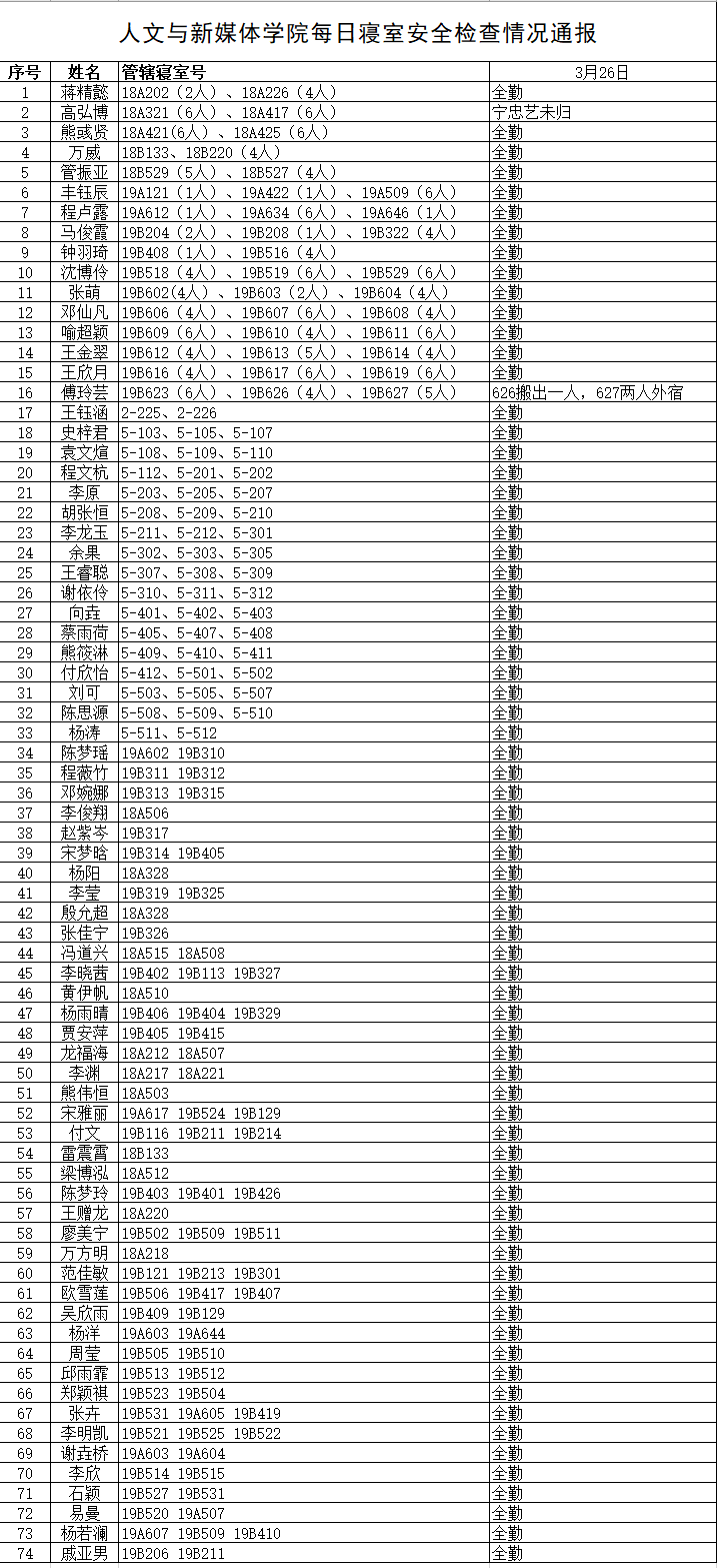 3月26日,我院组织学生干部对18、19级的宿舍进行每日寝室安全检查,现将考勤结果公布如下:
