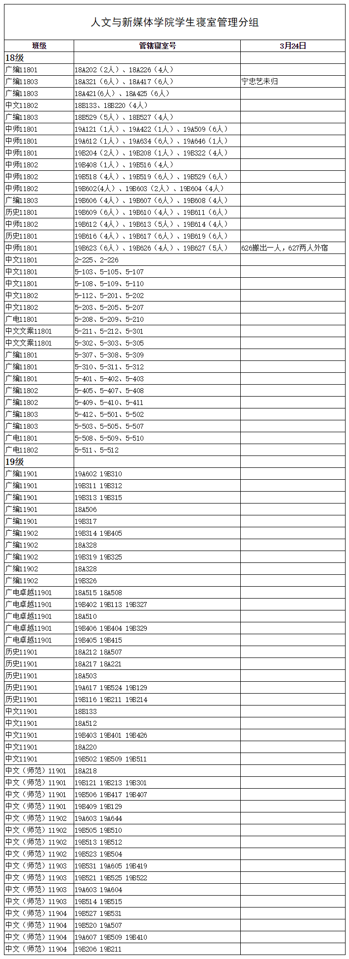 3月24日,我院组织学生干部对18、19级的宿舍进行每日寝室安全检查,现将考勤结果公布如下: