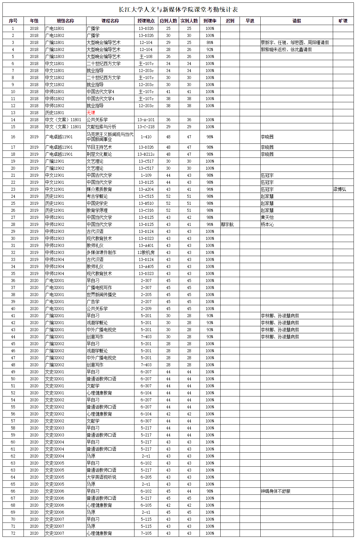 3月23日,我院组织学生干部对18、19、20级30个班的33门课程进行了72次课堂考勤,100%到课率53次,现将考勤结果公布如下: