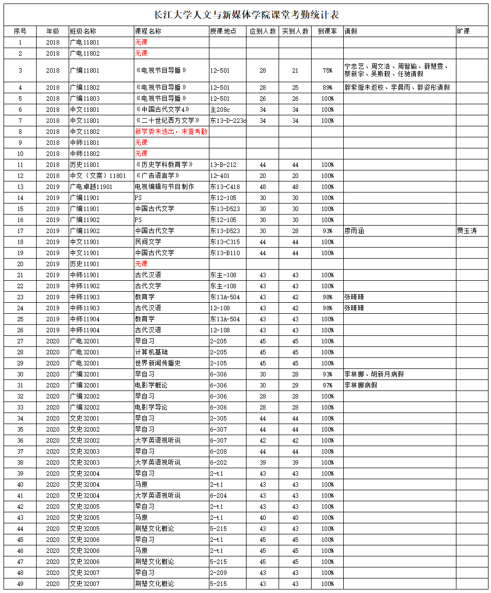 3月11日,我院组织学生干部对18、19、20级30个班的20门课程进行了46次课堂考勤,100%到课率36次,现将考勤结果公布如下: