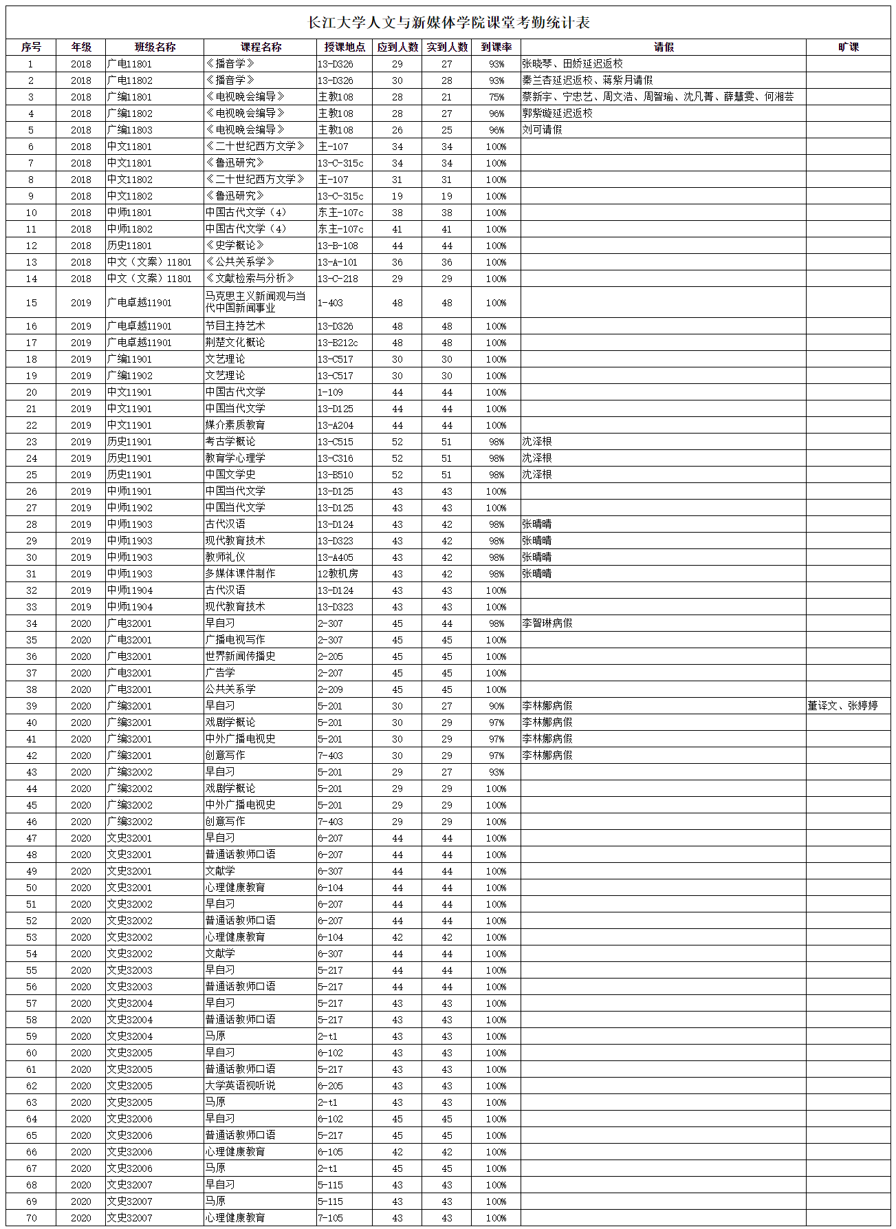 3月9日,我院组织学生干部对18、19、20级30个班的30门课程进行了70次课堂考勤,100%到课率52次,现将考勤结果公布如下: