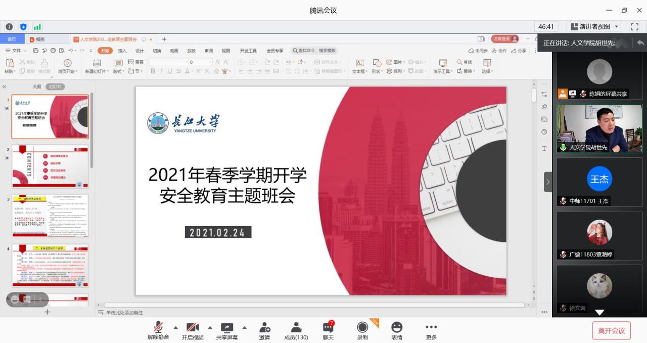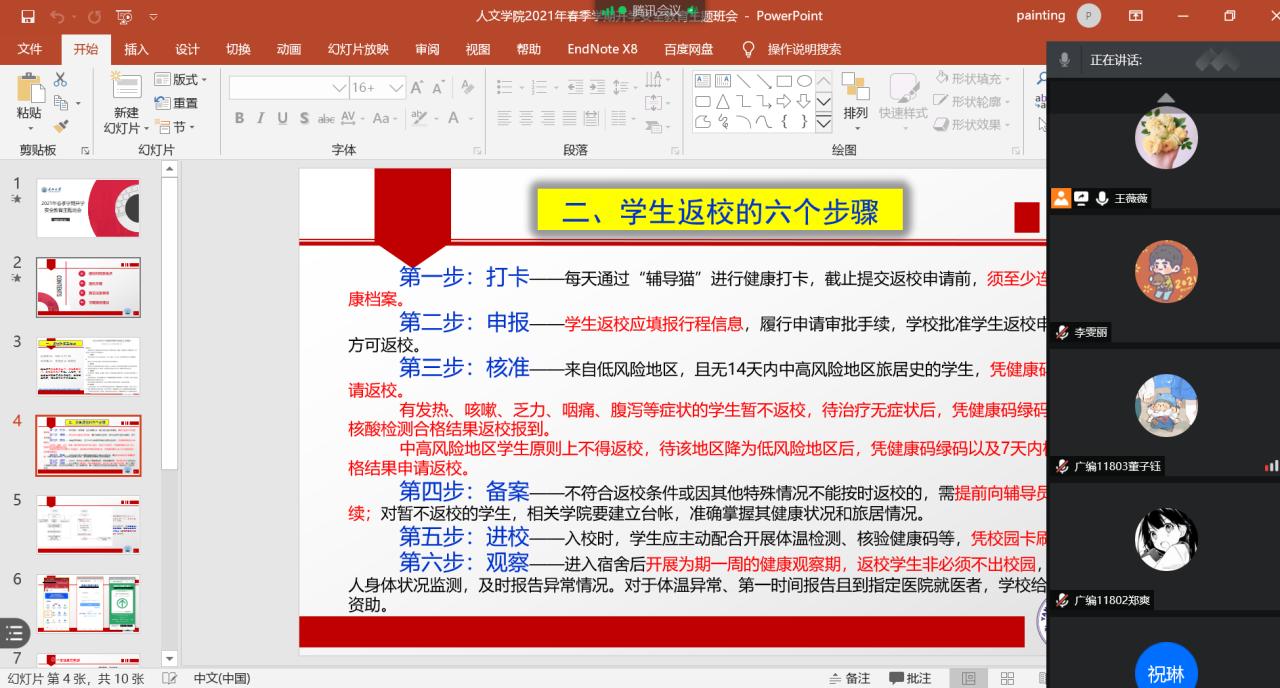 学院通过2021年春季学期开学安全教育主题班会,带领学生一起学习返校步骤和注意事项等,对返程前、返程中、返程后的个人防护、返校流程等做了详细的解答,引导学生安全返校。
