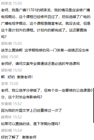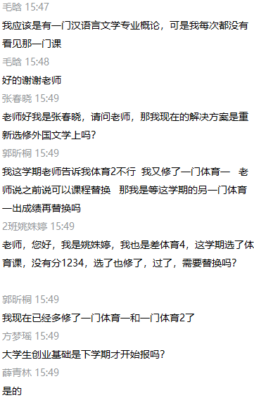会议伊始,张丽老师对6776永利集团人才培养方案及学分管理办法做出总体说明,指出学生学分修习主要分为三部分:必修课学分、选修课学分及实践学分。其中公选课(限选)、实践课为必修科目,所有学生必须修习且拿到学分,并就已上传的《学生未修习课程情况统计.xls》文件举例说明了类型化问题,为学生解答疑惑。同学们通过文字或语音展开提问。张丽老师逐一进行回答指导,提醒同学双学期课程可在下学期报考重修,一定要结合自身情况关注学校通知。