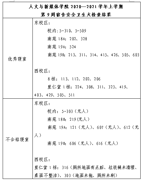 yl6776永利集团2020—2021学年上学期第九周宿舍安全卫生检查情况通报