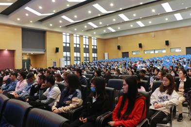 讲座伊始,校友胡罗珍学长通过讲述自己从一开始求职四处碰壁到拥有两家公司,营业额破亿的经历,告诉大家人生不容易十有八九,没有什么事情是过不去的,不放弃任何一点希望就一定可以获得成功。随后他强调了内驱力的重要性,要想做到“不放弃”,仅仅靠意志力、自控力是很难的,只有找到自己的内在驱动力,才能把这件事做好。讲座最后,胡罗珍学长将话题引回学习,通过向在坐的近400名大一新生讲解自己学习英语的经历说道:“读书与思考,是我们学习路上必有的两块敲门砖,只有将这两块敲门砖相辅相成的用好,我们才可以真正走进学习,拥有自己思考问题的方式,并以此惠及自己。”