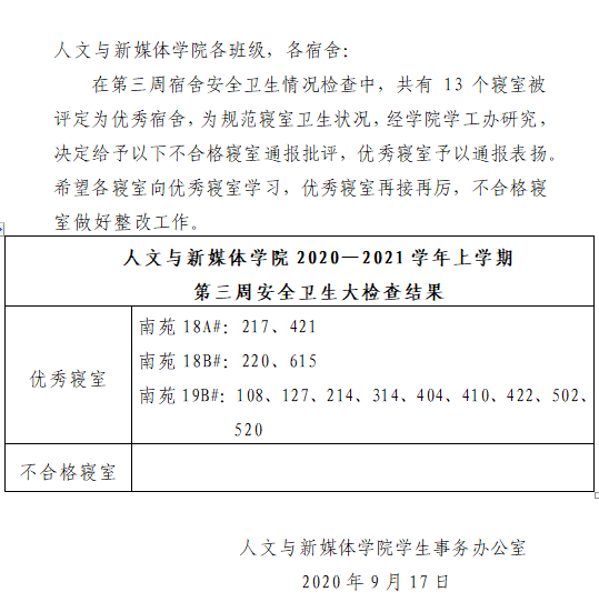 yl6776永利集团2020—2021学年上学期第三周宿舍安全卫生检查情况通报