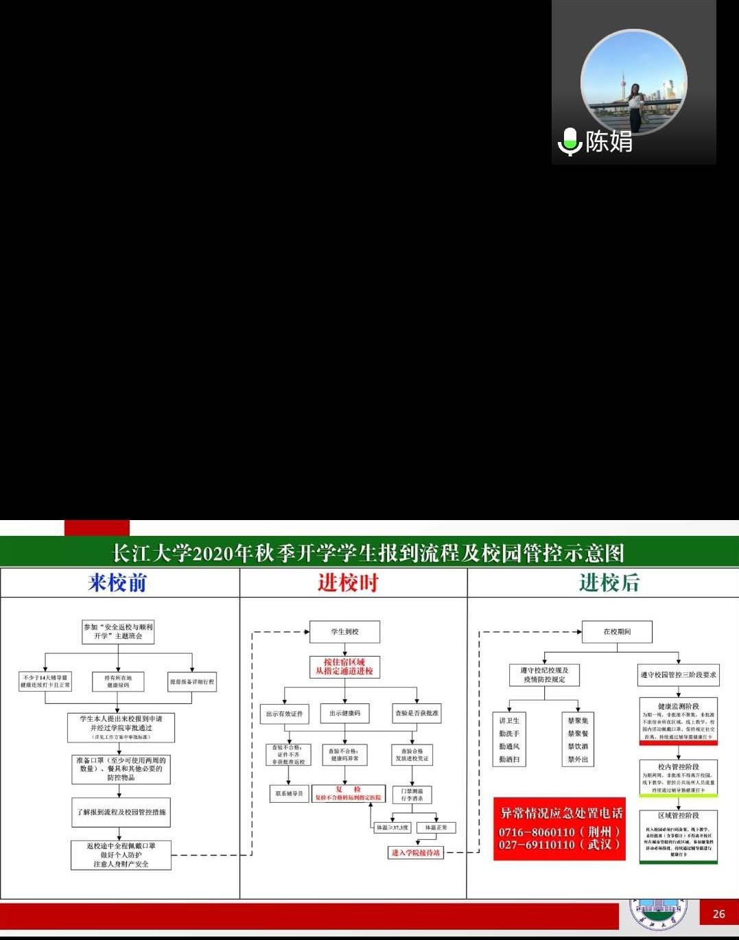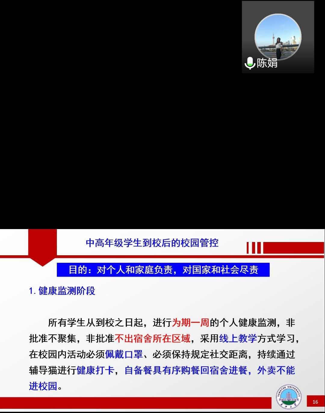 本次班会的内容主要分为学生返校前的准备、学生进校流程、学生到校后的校园管控、关注心理健康、学费缴纳与注册和学业规划六个部分,重点强调了开学前的各类注意事项和到校之后的各类须知,要求同学们在报道后遵守学校各类规章制度,加强常态化防控疫情,如有特殊情况及时向辅导员老师反馈。陈娟老师在会中强调“疫情尚未过去,仍需打起十二分的精神来面对它,谨防反弹,需要我们每个同学积极参与,期待疫情之后我们可以自由在校园中漫步。”会议的最后,陈娟老师嘱咐同学们珍惜宝贵的研究生学习生涯,与同学、老师之间形成良性互动模式,积极与导师交流,同学之间相辅相成才能有更大的成就。