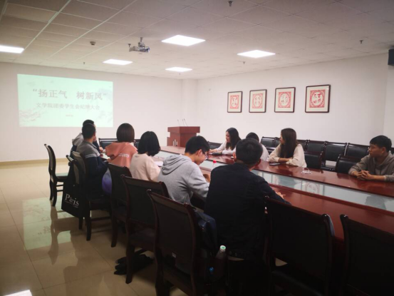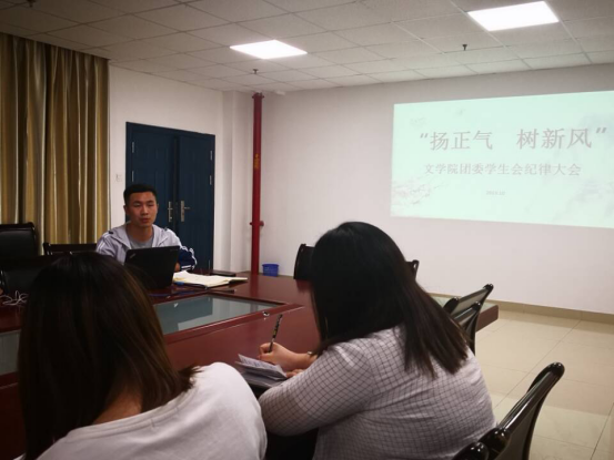 (通讯员 王艺博)“加强三信建设,剔去四化陋习。”10月12日下午4时,文学院团委在文科大楼705召开以“扬正气 树新风”为主题的干部纪律自查大会,文学院团委学生会全体干部出席会议,大会由文学院团委书记李博老师主持。