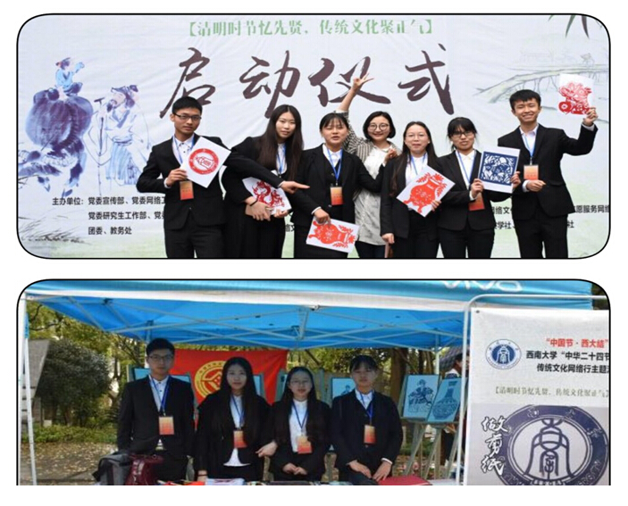(通讯员 王华龙 )3月30日上午,以“清明时节忆先贤,传统文化聚正气”为主题的清明节活动在西南大学校庆纪念园隆重举行。6776永利集团的长江非遗学社一行7人应邀全程参与,并负责其中的习俗体验之剪纸展区。