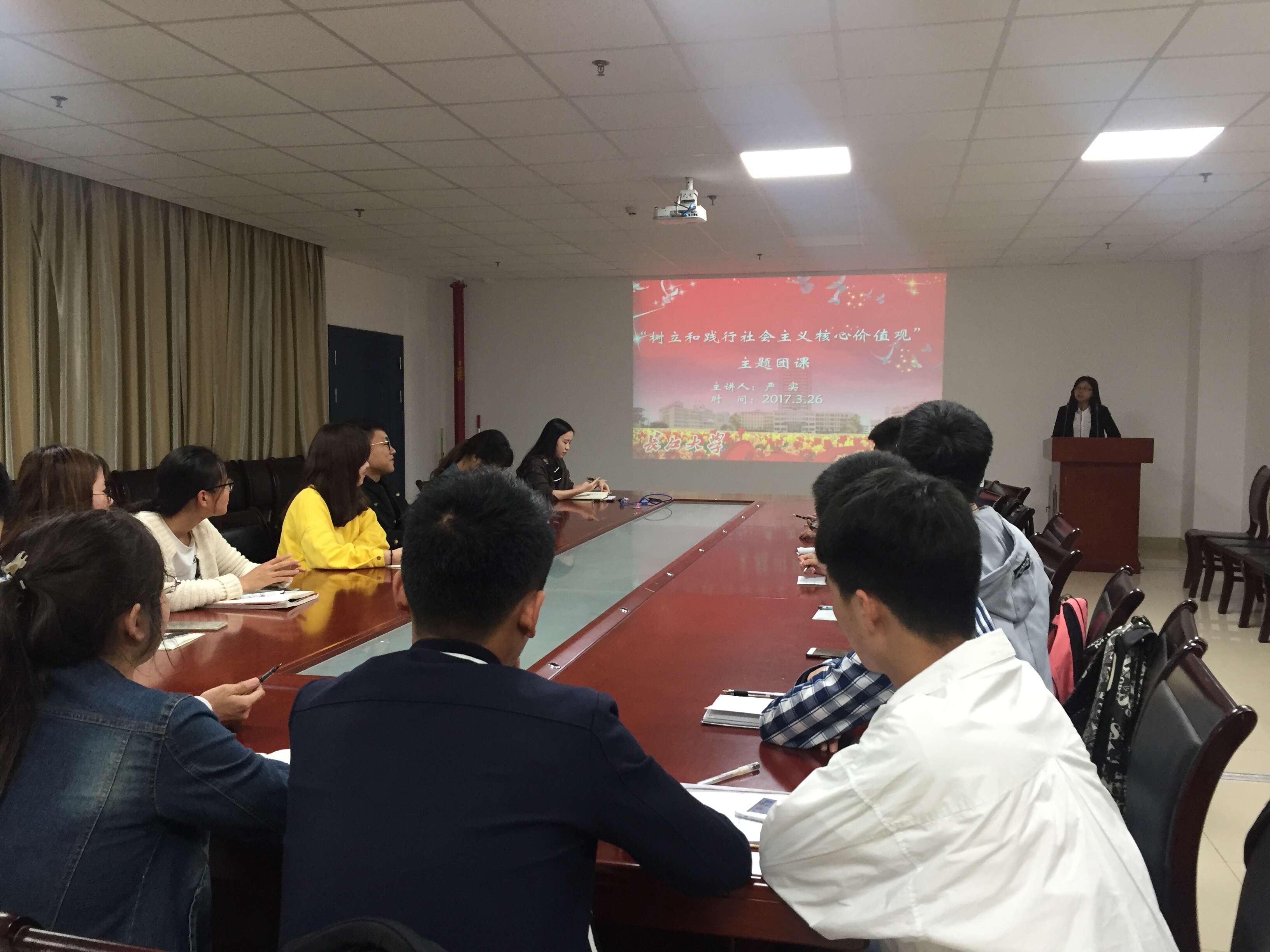 随后,严实老师就工作任务做了大致分工,宣传部要一如既往做好舆论宣传推广工作,充分利用现有各种途径,积极地在院里班里宣传。组织部依旧需要做好团建工作,让每个团员接受良好的组织生活锻炼,都有意识去自觉学习和践行社会主义核心价值观。各位团支书也要积极配合院里工作,让班级学生积极践行,认真学习2013年5月4日习近平总书记在同各界优秀青年代表座谈时的重要讲话。