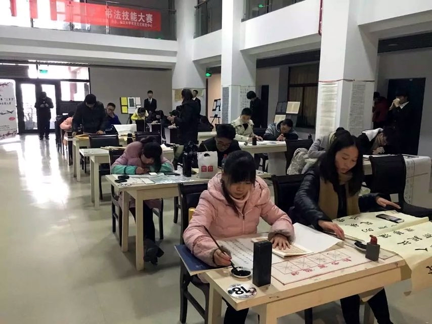 大厅里挂满了各参赛选手们的初赛作品,吸引着众同同学驻足欣赏。比赛开始后,来自我校不同院系的选手们纷纷拿出笔墨,现场书写作品。其中,硬笔组选手书写刚劲有力,字迹隽秀挺拔;软笔组选手的作品行云流水,笔走龙蛇。