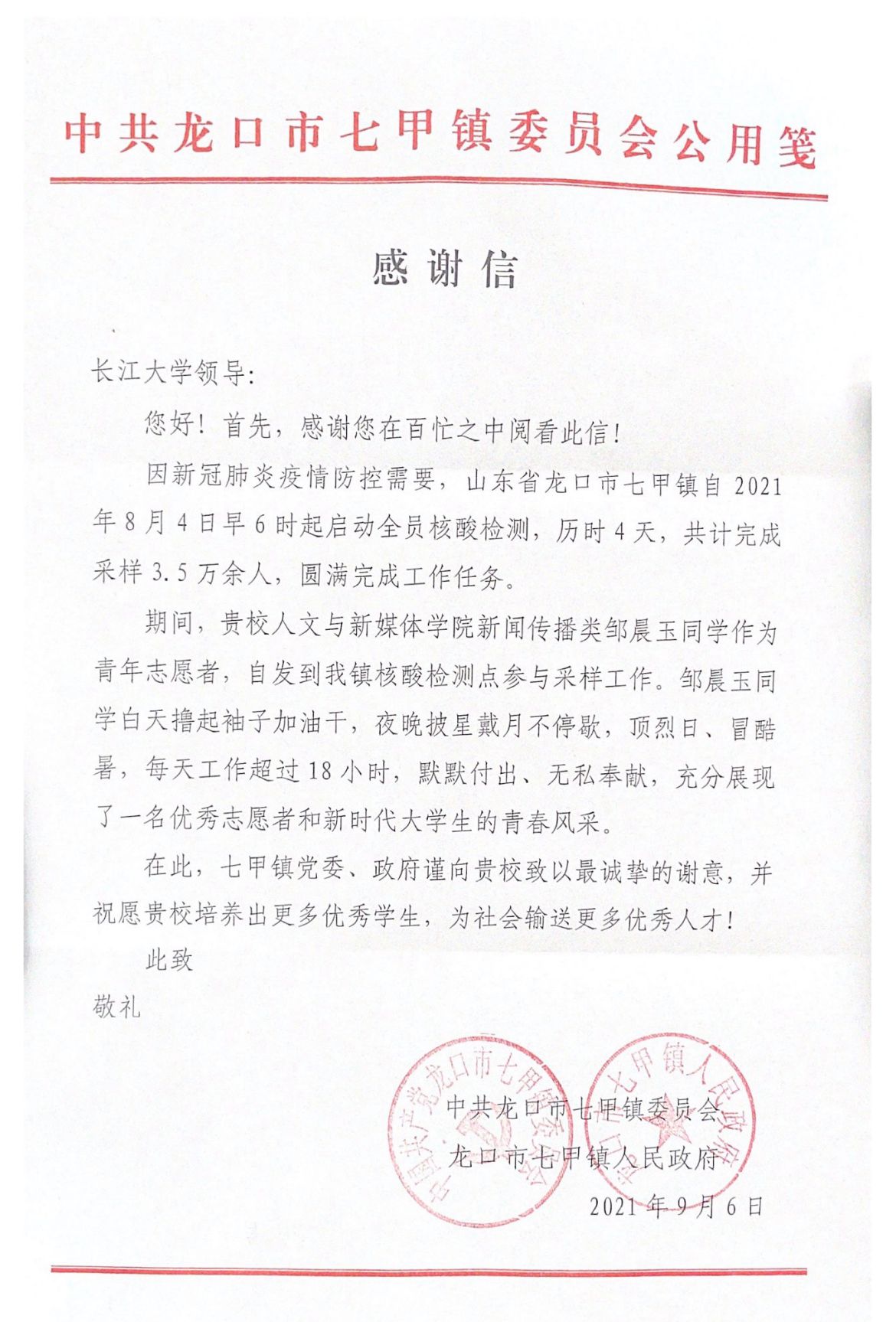 近日,我院收到山东省龙口市七甲镇感谢信,当地政府对我院学子表达了感谢。84日,热浪与疫情共同来袭,因新冠疫情防控需要,山东省龙口市紧急展开全员核酸检测,我院大一新生邹晨玉自发到龙口市七甲镇参与核酸采样志愿服务活动。