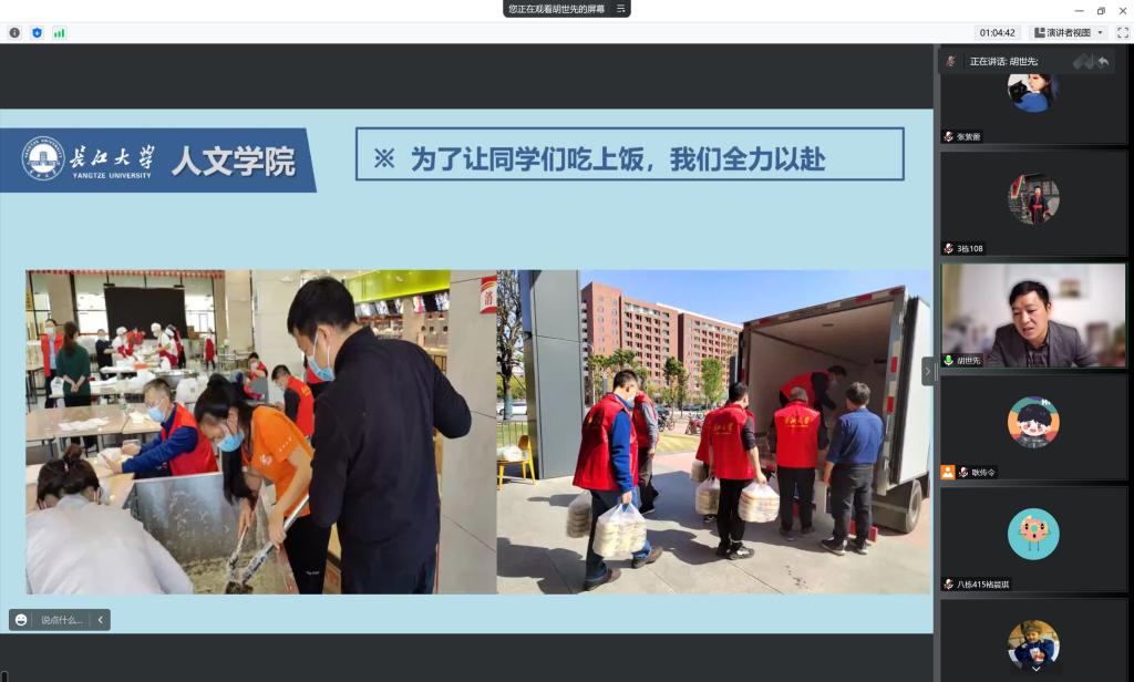 最后,胡世先老师分享了他的抗疫故事。他表示,为了让同学们吃上饭,学校老师全力以赴。在抗击疫情时,学校各位老师们不仅以老师的身份帮助着同学们,更是以志愿者的身份守护着同学们。他们战斗在没有硝烟的战场,为学生撑起“安全伞”。