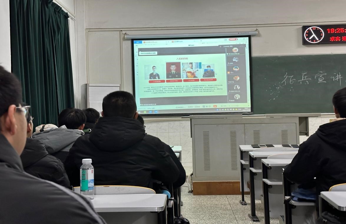 首先,周杨同学向大家分享了他在军旅生活的所见、所闻、所感。他表示在部队中学到了很多,从入伍时的懵懂,慢慢成长到退伍时的纪律严明、崇尚集体。紧接着,吴嘉怡为同学们重点讲解了大学生应征入伍的个人条件、应征指南和优惠政策并且回答了一些想要入伍的同学所担忧的问题。最后,分享了她在军旅生活中的成长和进步。