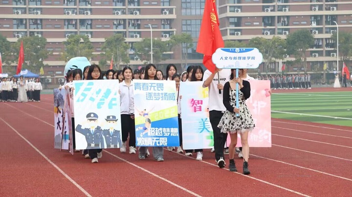 运动会是青春最好的文案。绿茵操场,喧嚣鼎沸。开幕式上,我院学子高举“青春无畏、逐梦扬威、超越梦想、激情无限”展板,高喊“魅力人文、团结一心、奋勇向前、突破极限”口号,怀着坚定的信念昂首阔步迈进红色跑道。他们意气风发、步履坚定,充分展现了我院学子奋勇向前的精神风采,喊出了我院学子踔厉奋发的精神风貌。