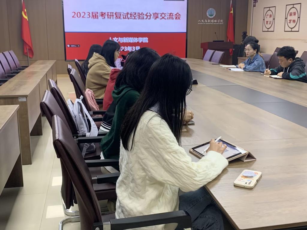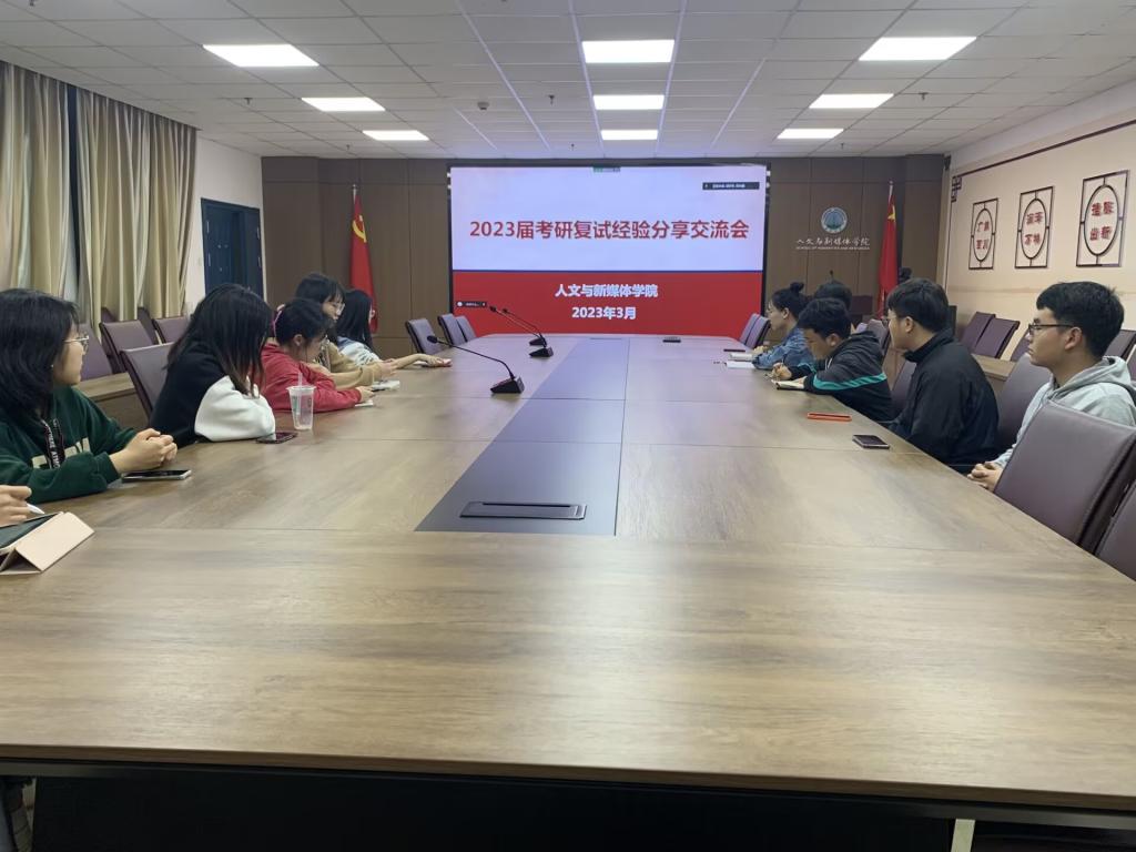 为做好我院考研学生复试指导,增强我院考研学子复试信心。3月10日晚7:00,我院在文科楼705会议室举行2023届考研复试分享交流会。本次分享交流会特邀湖南师范大学梁欣玥、湖北大学余跃,以及本校学生李靖、李应美主讲,田华蓉老师主持,19、20、21级学生参与。