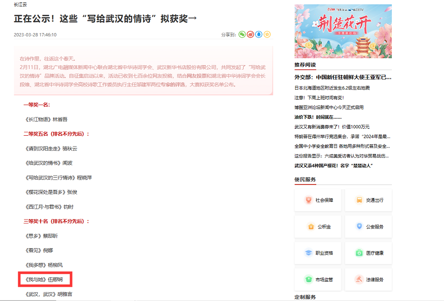 (通讯员 彭超 伍卿娴)近日,由湖北广电融媒体新闻中心联合湖北省中华诗词学会、武汉新华书店股份有限公司发起的“写给武汉的情诗”品牌活动获奖名单公布。我院中师12104班伍卿娴同学的作品《我与她》从七百余篇参赛作品中脱颖而出,获得三等奖。