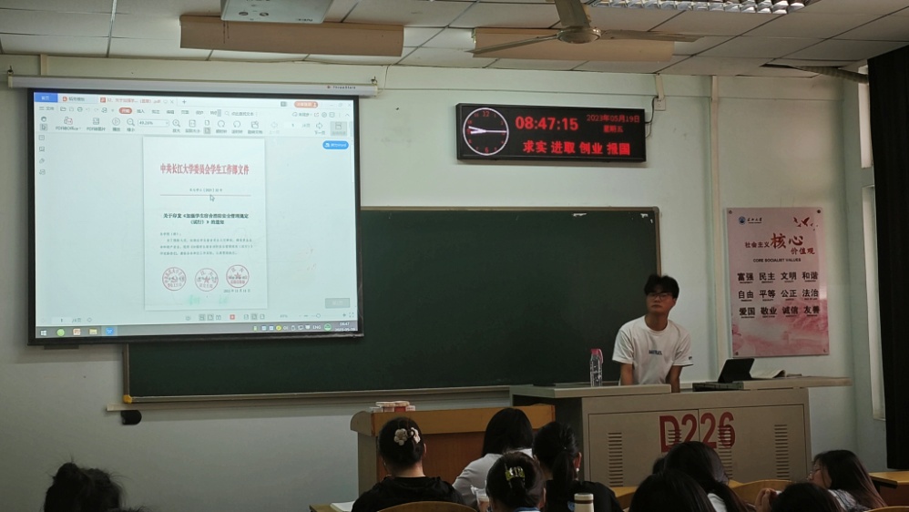 在主题班会上,班主任、辅导员、副班长向学生宣讲消防安全、交通安全以及防溺水安全、防电信诈骗等方面的知识,传授如何避免安全事故发生的应对方法。教育引导学生自觉增强安全意识,切实提高自我防范能力,努力形成人人讲安全、时时讲安全的良好氛围。