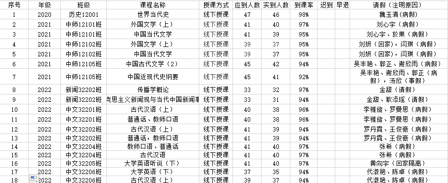 5月25日,我院组织学生干部对20、21、22级21个班的18门课程进行了40次课堂考勤,100%到课率22次,现将考勤结果公布如下:
