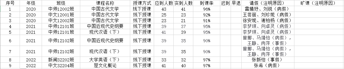 6月5日,我院组织学生干部对20、21、22级24个班的13门课程进行了32次课堂考勤,100%到课率23次,现将考勤结果公布如下: