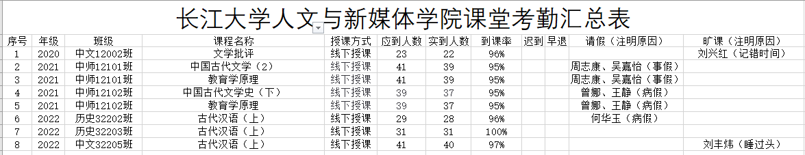 6月9日,我院组织学生干部对20、21、22级14个班的10门课程进行了19次课堂考勤,100%到课率18次,现将考勤结果公布如下: