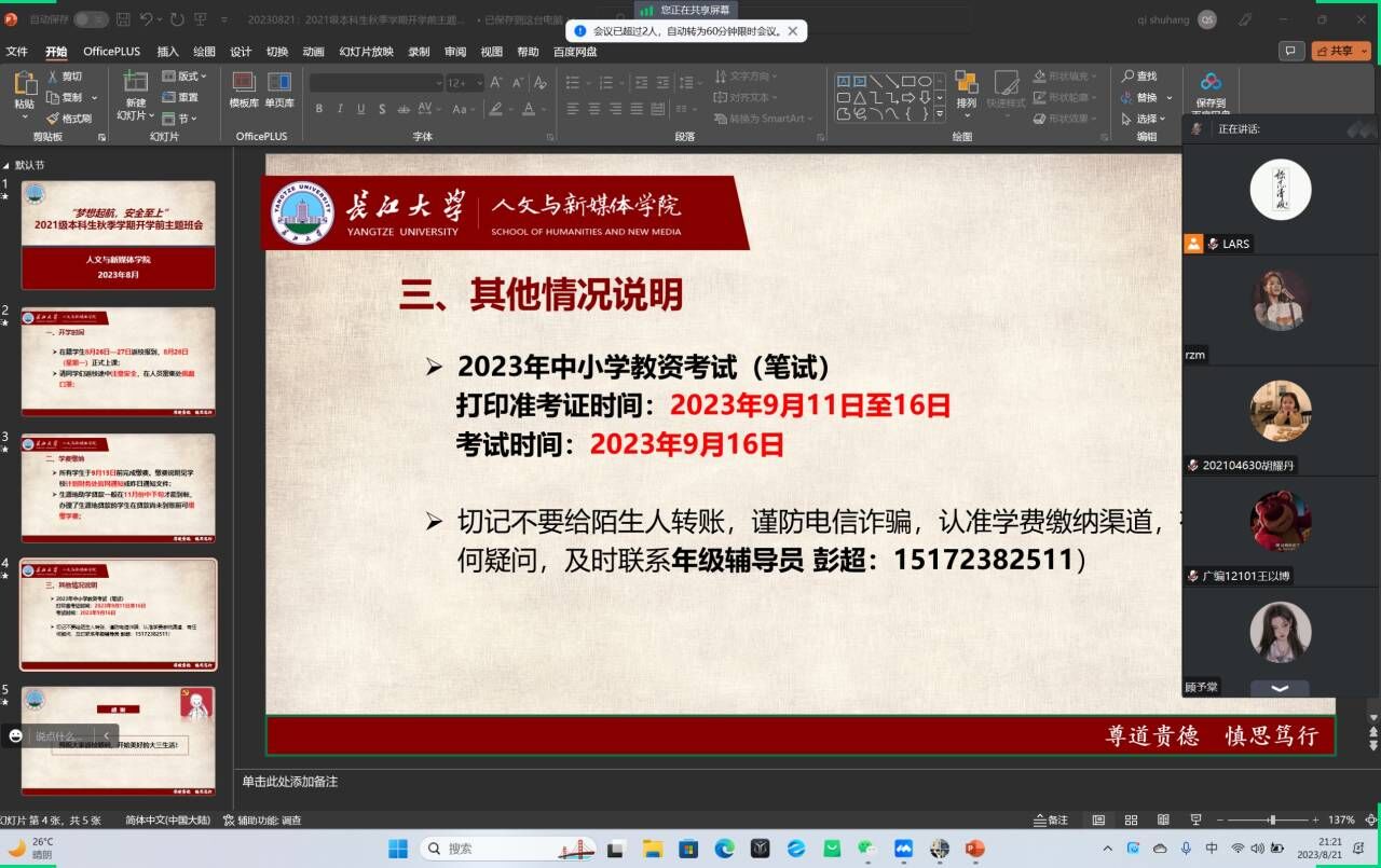 班会强调了开学时间和返校注意事项,提醒同学们注意返校安全,在人员密集场所佩戴好口罩,通过案例教学、安全提示等开展了生命安全教育、防溺水、防诈骗和心理健康教育,提高学生安全防范意识和自我保护能力。针对2023年2023级本科新生以及研究生新生,详细介绍了线上注册和线下报到的相关注意事项,在交流互动环节为同学们答疑解惑。