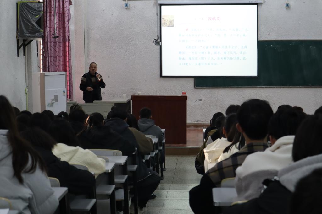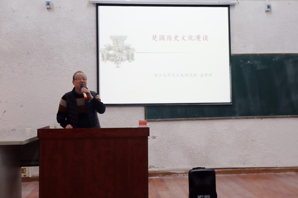 孟修祥教授引经据典,通过讲述标志事件简述了楚国从滥觞期、崛起期、鼎盛期到转化期的历史文化发展过程。从青铜冶铸、髹漆制作、音乐美术、丝织刺绣、老庄哲学、屈宋辞赋六个方面描述楚文化的六大支柱。从水乡泽国的灵秀环境、人神共娱的宗教氛围、闳识孤怀的狂人性格、独特超奇的思维方式四个方面解读楚国历史文化艺术特质。他指出,楚国八百年历史文化,以其楚魂楚风的无穷魅力吸引了古今中外数不胜数的人们,同学们要了解楚文化,传承与创新发展好楚文化。