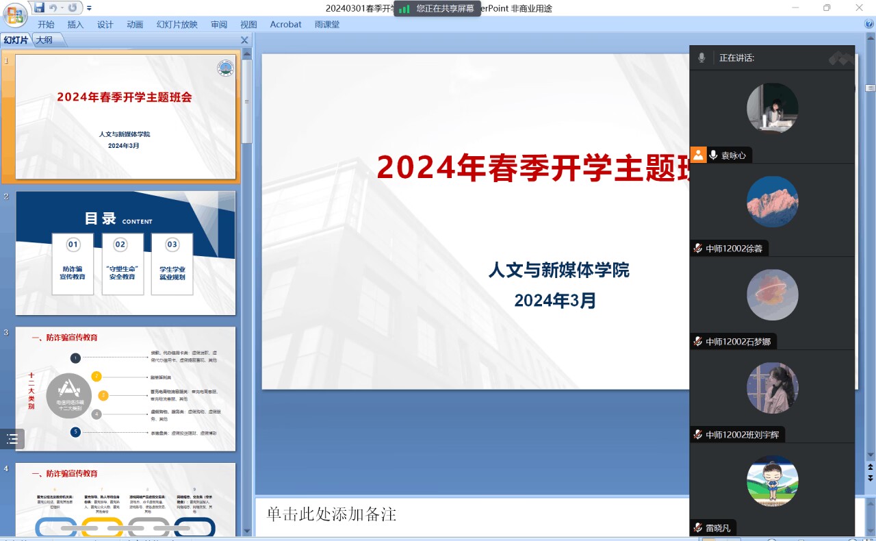 各班主要围绕防诈骗宣传教育、“守望生命”安全教育、学业及就业规划等方面进行教育与研讨,各年级有所侧重、形式多样。对低年级同学强调新学期目标及计划制定,引导他们积极参加创新创业活动;对高年级同学指导加强专业技能训练,锤炼过硬专业基本功,强化职业规划教育;对毕业班级学生强调实习及外出等安全问题,针对近期考研调剂、面试和招聘情况进行指导帮助,促进毕业生树立积极就业态度。